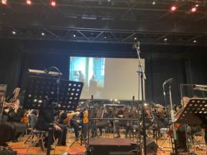 Musikinstrumente und Stühle warteten auf das Orchester.