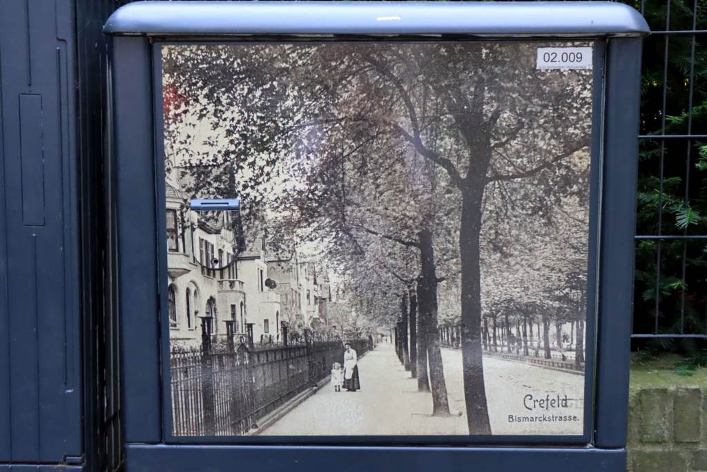 Für meinem privaten Blog habe ich mich vor einiger Zeit mal in meinem näheren Umfeld umgesehen und war erstaunt, wieviel Strom-, Post- und sonstige Verteilerkästen so am Straßenrand herumstehen. Angefangen hat es beim meinem Bäcker um die Ecke. Am Krefelder Bismarckplatz klebte plötzlich ein Bild eben dieses Platzes, aber aus dem letzten Jahrhundert, auf dem Verteilerkasten.
