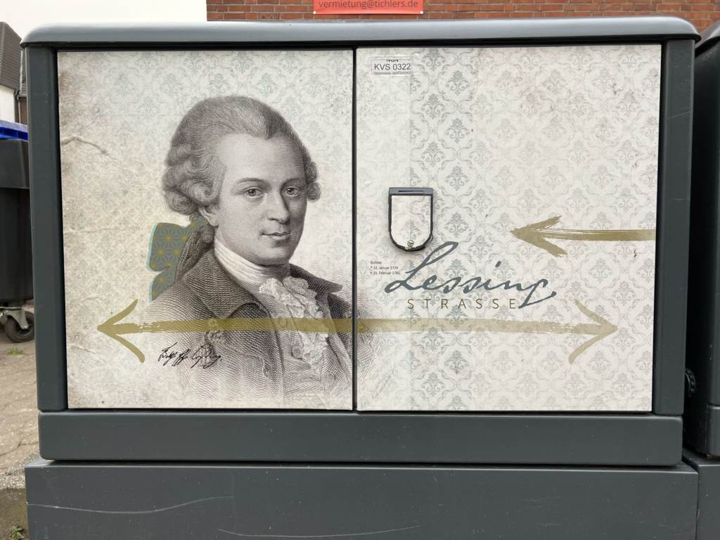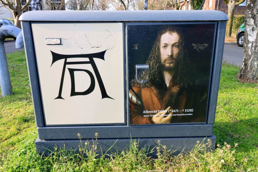Einige Zeit später fiel mir dann ein Bild vom Straßenzug gegenüber, auf einem weiteren Verteilerkasten auf, außerdem ein Bild von Albrecht Dürer an der gleichnamigen Straßenecke. Neben dem Bismarckviertel gibt es in der Nähe das sogenannte Musiker- und Dichterviertel mit Straßen wie der Schiller-, Goethe- oder Lessingstr., der Brahms-, Richard-Wagner, Haydn-, Schumann- und der Mozartstraße.