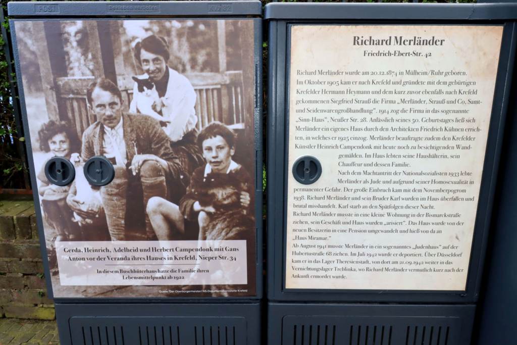 Um die Ecke befindet sich die Villa Merländer, bekannt als NS-Dokumentationsstätte der Stadt Krefeld (ich schrieb hier darüber). Die Verteilerkästen bieten die Gelegenheit auf jüdische Geschichte in dem Viertel aufmerksam zu machen. Zusammen mit der NS-Dokumentationsstätte und dem Stadtarchiv Krefeld wurden Bilder von Menschen und Familien ausgesucht, die hier gewohnt oder gearbeitet haben.