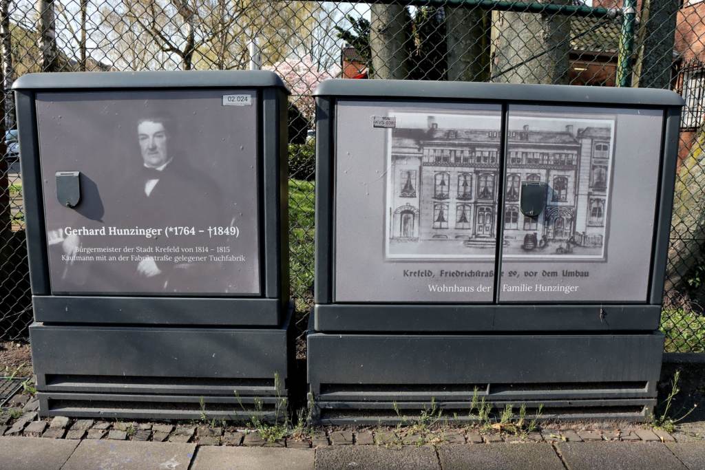 Alle diese Straßen haben Verteilerkästen und einige davon haben seit 2 Jahren Bilder mit Stadtgeschichte und namensgebenden Persönlichkeiten auf der Vorder- und teilweise auch auf der Rückseite. Entstanden ist eine Art Open Air Galerie. So richtig Fahrt bekam die Sache, als die Westdeutsche Zeitung von der Aktion auf der Roonstraße berichtete.