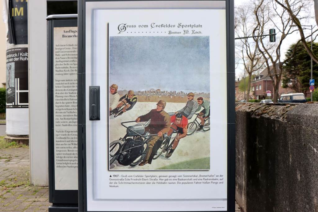 Weitere Verteilerkästen der Bürgergemeinschaft Bismarckviertel unter Leitung von Vorstandsmitglied Reno Müller sind nach und nach beklebt worden. So habe ich z.B. auch erfahren, daß sich vor gut 100 Jahren an der Grenzstr. Ecke Friedrich-Ebert Str. ein Ausflugslokal, eine Rennbahn und eine Badeanstalt namens Bremerhafen befand. So macht die Postkarte sinn, die auf dem Kasten nebenan aus Krefeld Bremerhafen grüßt. Alles was davon heute noch übrig ist, ist der Entwässerungsgraben.