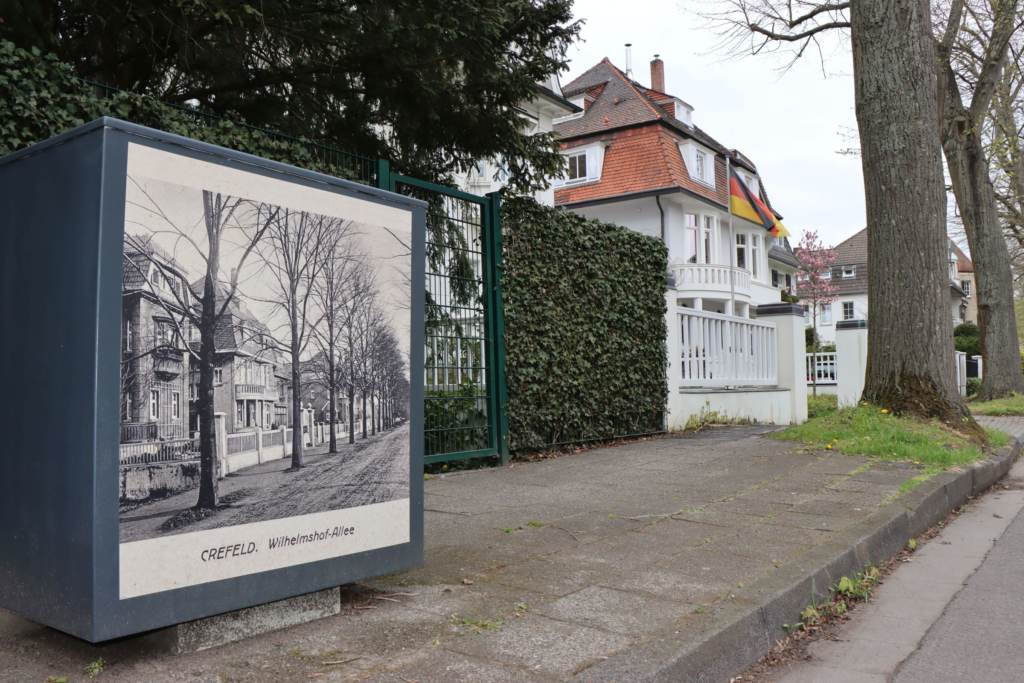 Der Namensgeber der Friedrich Ebert Straße, eben jener Friedrich Ebert, war sogar mal auf der 5,- DM Münze. Na, wer hat’s gewußt? Die Wilhelmshofallee, heute eine Durchgangsstraße vorbei an Haus Lange und Haus Esters ist noch gesäumt von schönen Häusern und Villen, wie sich auf einem alten Foto am Verteilerkasten wiedererkennen läßt. Gleich daneben wird erklärt, wie hier Ende des 19. Jahrhunderts die Baugebiete entstanden und Krefeld sich vergrößerte.