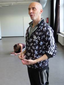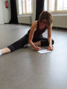 Übereinstimmend verfolgte auch Emanuele Soavi die These: „alles ist möglich, nichts muss sein, nichts ist falsch“. Um später eine kleine, persönliche Choreografie zu kreieren, entwickelte Emanuele Soavi, mit uns die Bewegungsebenen. Von den Fingerspitzen bis zu den Zehen. Arme ausgestreckt und dazu lösen wir uns aus der aufrechten Ebenen zur tieferen Ebene, Knien, Sitzen und Liegen in der niedrigsten Ebene. Zusätzlich durfte auf jeder Ebene, die Diagonale entdeckt werden. Alles verbindende Element, die im nächsten Step dienten, die einzelnen Tanzbewegungen dynamisch zu vereinen. Auch der, bis dahin, ohne Bedeutung im Raum stehende Tisch konnte einbezogen werden. Ein wichtiger Bestandteil der Performanz war für einige Teilnehmer, ob mit oder ohne Musikbegleitung. Natürlich bekamen die kreativ gestalteten Performanz Zeit und Raum.