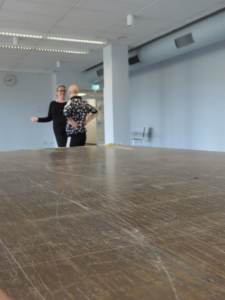 Der große, lichtdurchflutete Saal in der Heeder stand den KursteilnehmerInnen für drei Stunden zur Verfügung. Miriam Leysner, Tanzpädagogin und Choreografin, gab uns Laien mit ihrem angeleiteten Warm-up den Einstieg in den Workshop. In welche Richtung können wir uns bewegen. Nach Vorn, nach Hinten, zur Seite. Ist unser Gang kurvig, vorwärts, seitwärts? Benutzen wir die Diagonale? Können wir uns noch dazu auf die Namen der Kursteilnehmer konzentrieren?