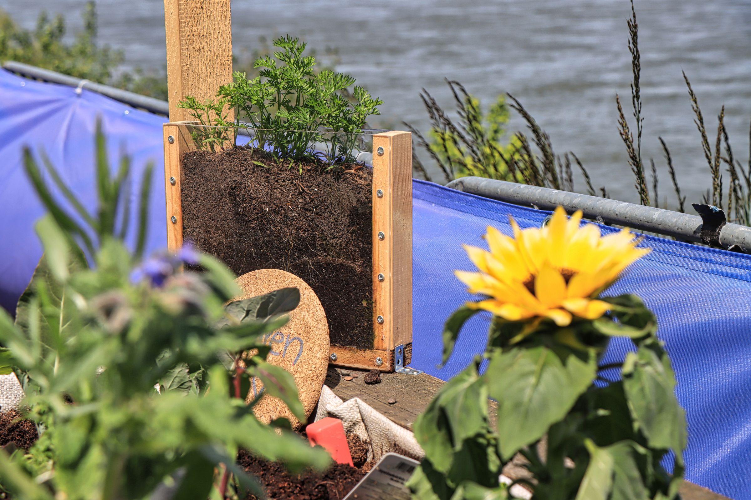 Kleine Mäuse, gehäkelte Pilze, lesende und spielende (Playmobil) Kinder, grimmig guckende Blumentöpfe, Zwerge, es ist alles dabei und alles direkt am Rhein. Ganz originell fand ich den kleinen gläsernen Schaukasten, in dem man bald den Möhren beim Wachsen zugucken kann. Ansonsten warten wir auf das „Kraut der Unsterblichkeit“, oder?