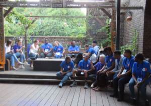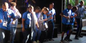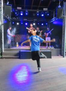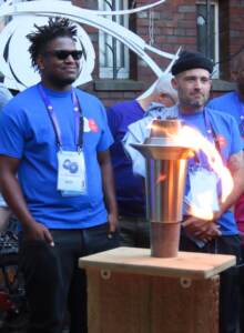 Die Anstrengungen, die die Anreise und der Besuch der Burg Linn erforderten, waren den Gästen nicht anzumerken. Mit dem Betreten der Tanzfläche scheint es nur sie und die Musik zu geben. Eine fröhliche Schar von jungen, meist People of Color, Menschen, die sich in ihrer Gemeinschaft wohlfühlten. Vielleicht hätte eine Einladung an junge Krefelder Sportlerinnen in gleichen Disziplinen zu mehr Austausch geführt, somit blieb die Gruppe vorwiegend unter sich. Bevor die kleinere Formation von Mondo Mashup mit Schwung aufspielte, wurde die Gesellschaft zu einem Zeremoniell der Entzündung der olympischen Flamme in Miniaturformat eingeladen.