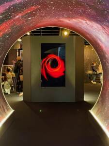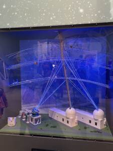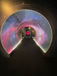 Wir befinden uns auf der MS Jenny (eigentlicher Name), die bis vor 20 Jahren ein klassisches Binnenfrachtschiff war. Dann wurde sie umgebaut und seitdem findet hier jedes Jahr eine neue Ausstellung statt. Von Mai bis Oktober fährt das Schiff durch ganz Deutschland, beginnt in Berlin und endet in Wien/Österreich. Die Ausstellung hat immer ein neues Thema. Dieses Jahr ist es „Unser Universum“, lassen wir uns faszinieren!
