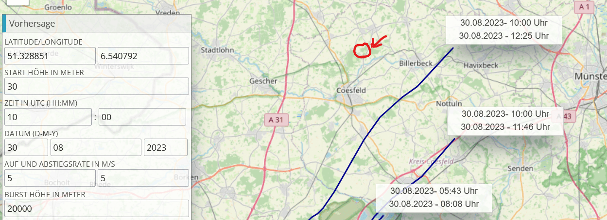 Der Wetterballon der DWD-Station Essen in der Nacht ist 40 km weit nach Nordosten geflogen. Vor der Regenfront verstärken sich jedoch die Höhenwinde. Die Prognose erwartet den Landepunkt 100 km entfernt im Kreis Coesfeld. Immerhin gibt es dort viel landwirtschaftlich bearbeitete Flächen und so rechnet man mit einer schnellen Bergung. Es fallen schon die ersten Regentropfen, als sich das Team auf den Weg in das vermutete Landegebiet aufmacht.